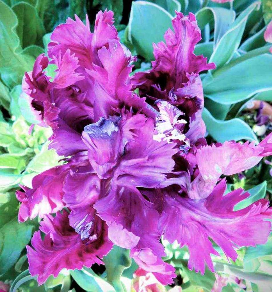 パロット咲チューリップ、ビクトリアンシークレットです🌷💙😍💜😍色彩は、もっとブルー寄りの紫なんですが、写真では赤紫に見えますねー😅💦少し修正してみたけれど、実物寄りにはならないみたいです😢花型が、ブルーパーロットなどに比べると激しくフリフリのフリルになっていて、まさにオウムの飾り羽みたいになってます😅💦好みは分かれそうですね~私はブルーパーロットくらいの控えめのフリルのほうが好きですが、こういうのも面白くていいなとは思います😊😁🦜