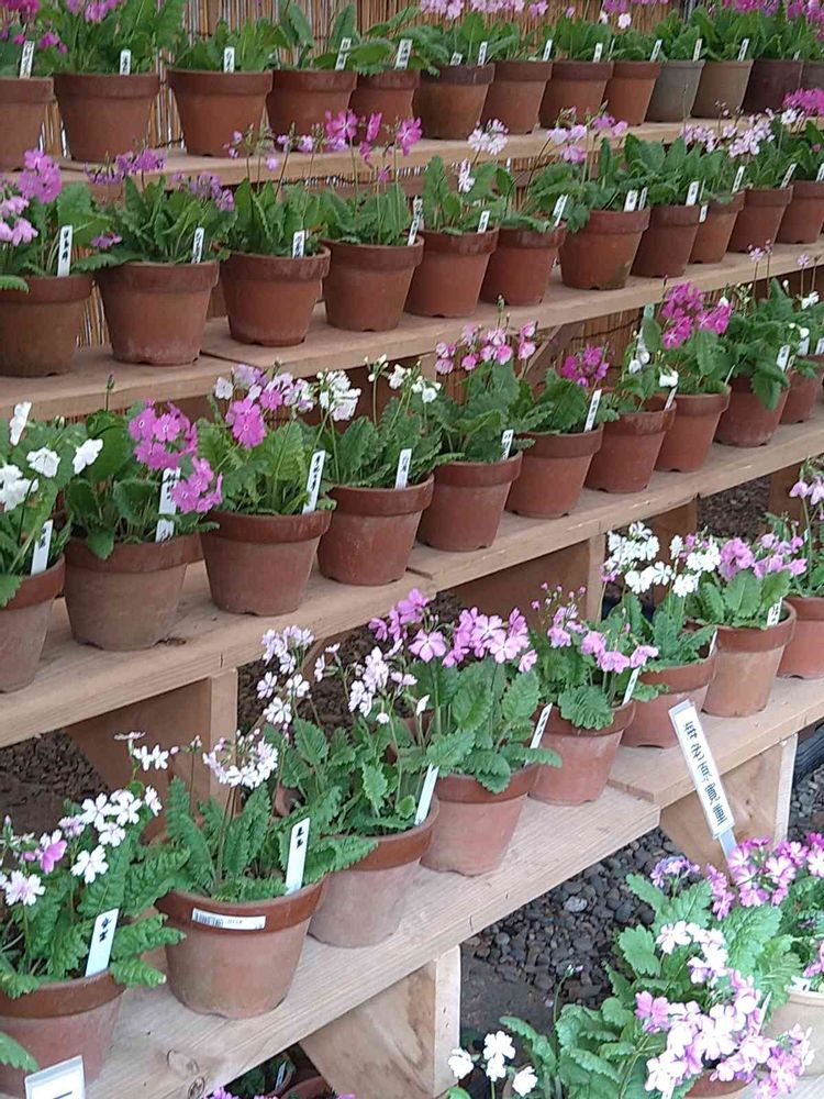 近くの神社で恒例のサクラソウ展覧会が開催されています。