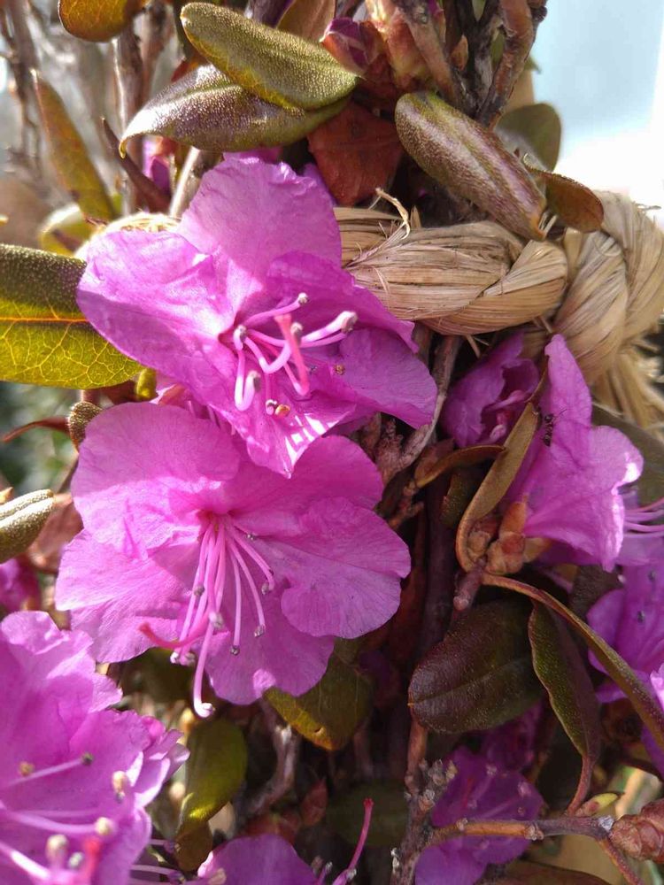 散歩中、まだ冬囲いが外されていないけど頑張って咲いていたエゾムラサキツツジ。
