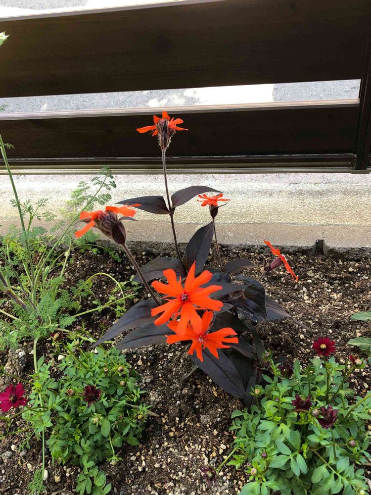 紫色の枝葉に濃いオレンジ色の花で鮮やかです