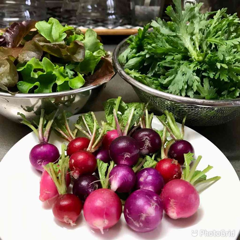 週末日曜☁️朝の畑の恵みは、カラフルなラディッシュ💜❤️💖など。