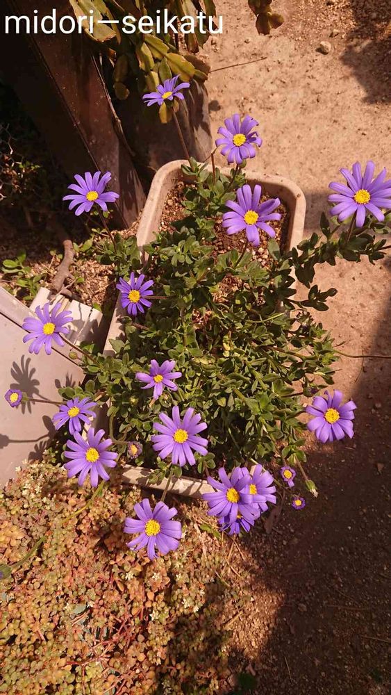 いい天気が続きそうです。我が家のブルーデージー。陽に当たって気持ちよさそう。いい色です。