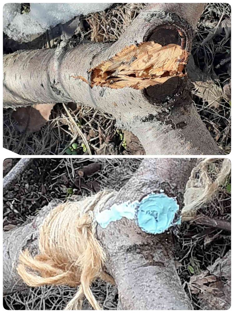 桃の木が雪の重さで裂けました😭なんとか治してみましたが……水分が通いますように🙏