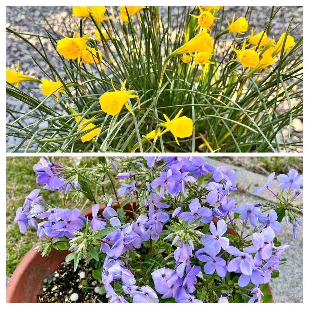 鉢植えのペチコートスイセンとツルハナシノブが満開になりました。