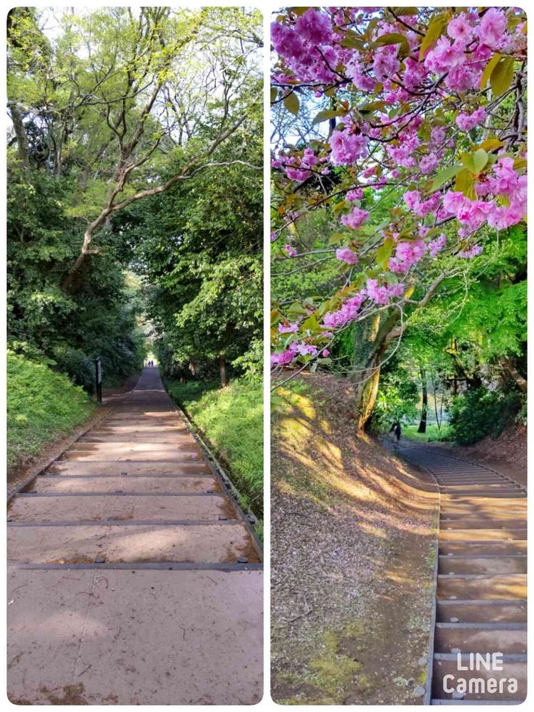 池への結構長い階段坂道。息切れしながら登り切ると八重桜が出迎えてくれました。