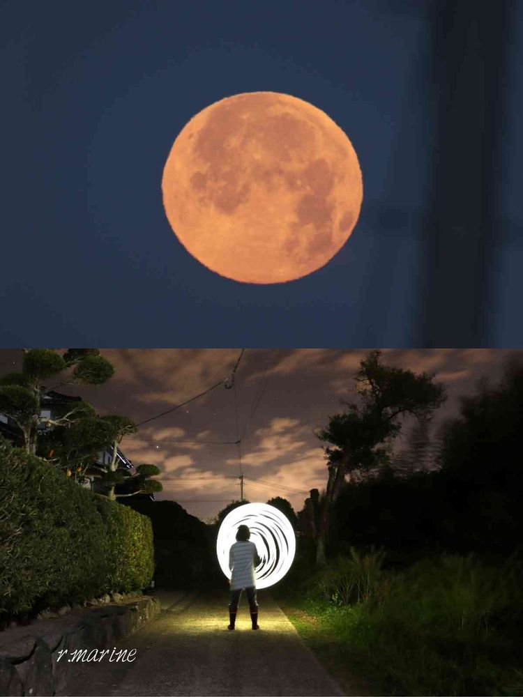 電柱や電線が入り込みましたが、綺麗なピンクムーン撮影出来ました