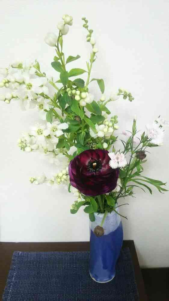 連投。こちらも残り花で一輪挿しです。背の高い花器なので利休梅も高めに。花瓶口にラナンキュラスを配置して安定感とバランスをとっています。