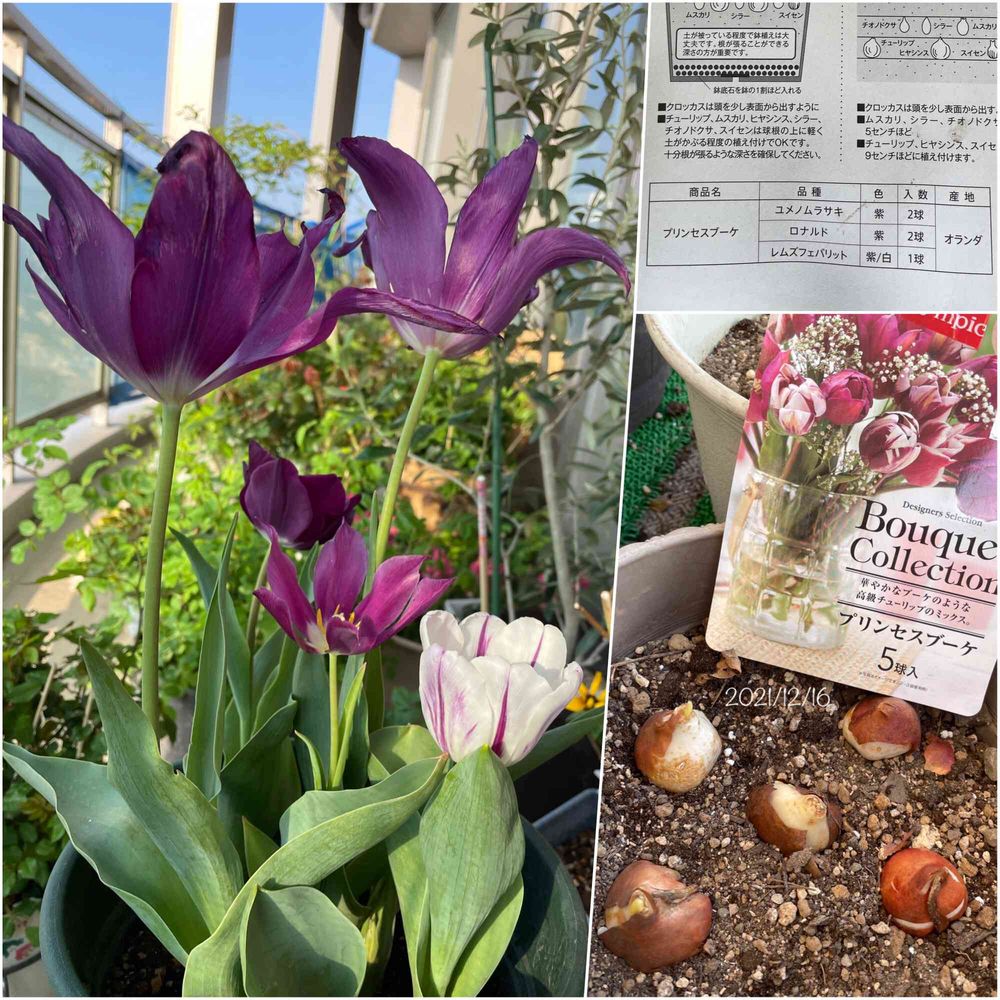 先に咲いた2輪は3/31にupしたときにプリンセスブーケと言ったのですが、これは商品名で、品種はユメノムラサキでした🌷ラベルの裏にちゃんと載ってました。