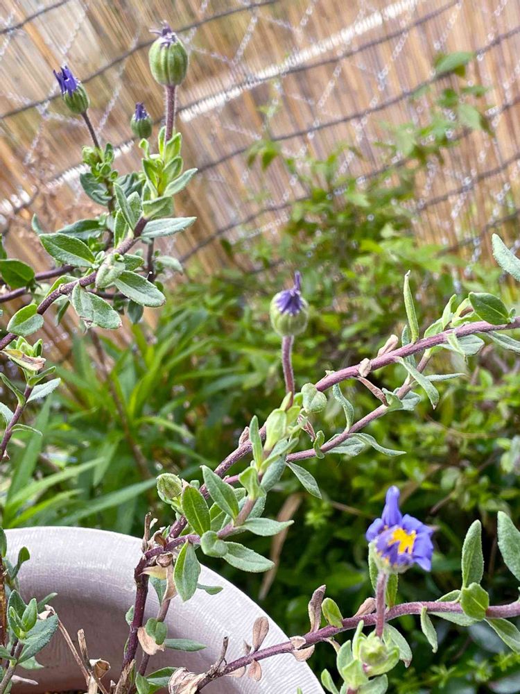 令和4年4月18日(月)薄曇り☁️☁️おはよー╰(*´︶`*)╯♡ございます 小さい庭で朝の見廻りしています。春雨☔️に我が家のブルーデイジー🌸 ヤーっとお目覚めの様子🎶 棚に乗せて在るのにナメクジが😳😤投げつけてやりましたー