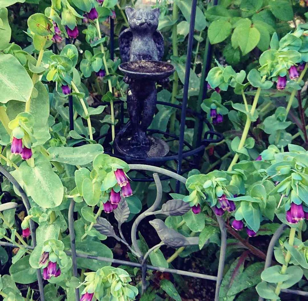 手の上のトレイに小物を乗せる雑貨なんですが、「小さなバードバスみたい💡」って思ってお庭に置いてます😁