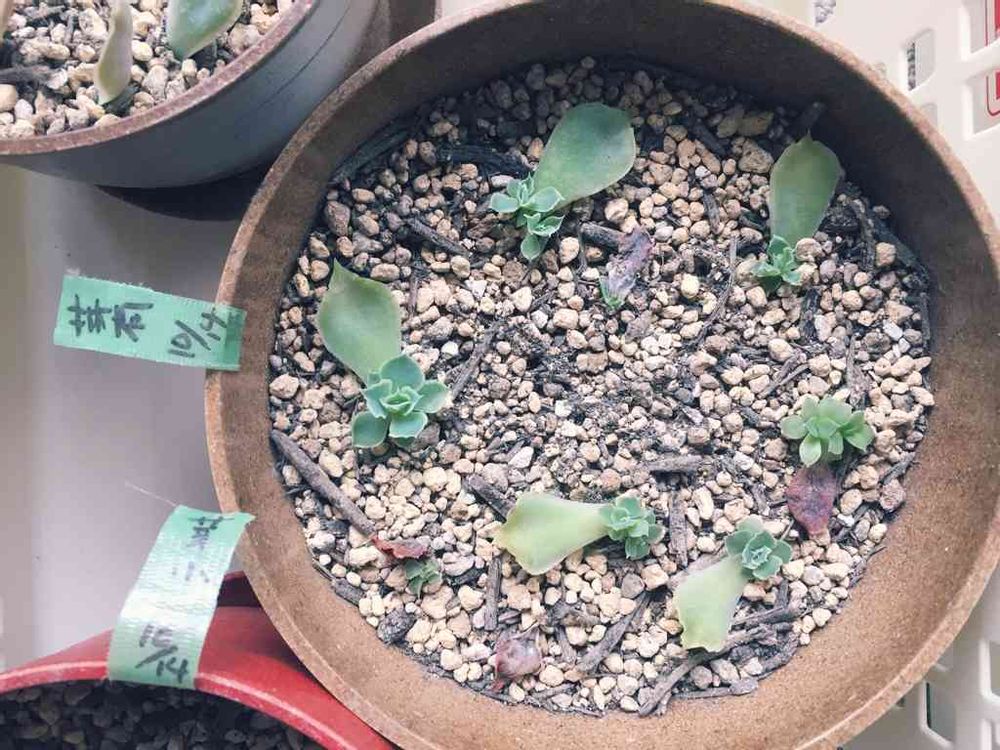エケベリアの葉挿しは、根が出たら水をしっかりあげて生育させたほうがいいね。水を切らし、ゆっくり育てて元の葉の栄養をなくしてしまうと、あとの栽培が大変^^;