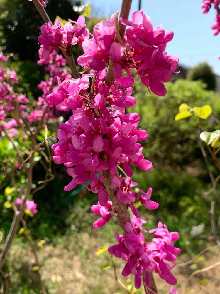 スオウバナとも呼ばれています。インド原産のマメ科のスオウから採れる赤色の染料で染めたような花の色をしているからハナズオウの名前が付きました。