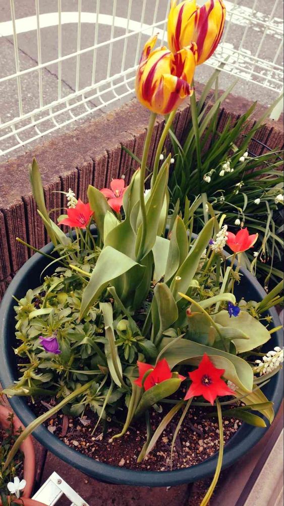 紫パンジー達が徒長し、切り戻し、「トリプルデッカーも終わったかぁ😌」と思っていたら、原種🌷が咲き出しました🙌