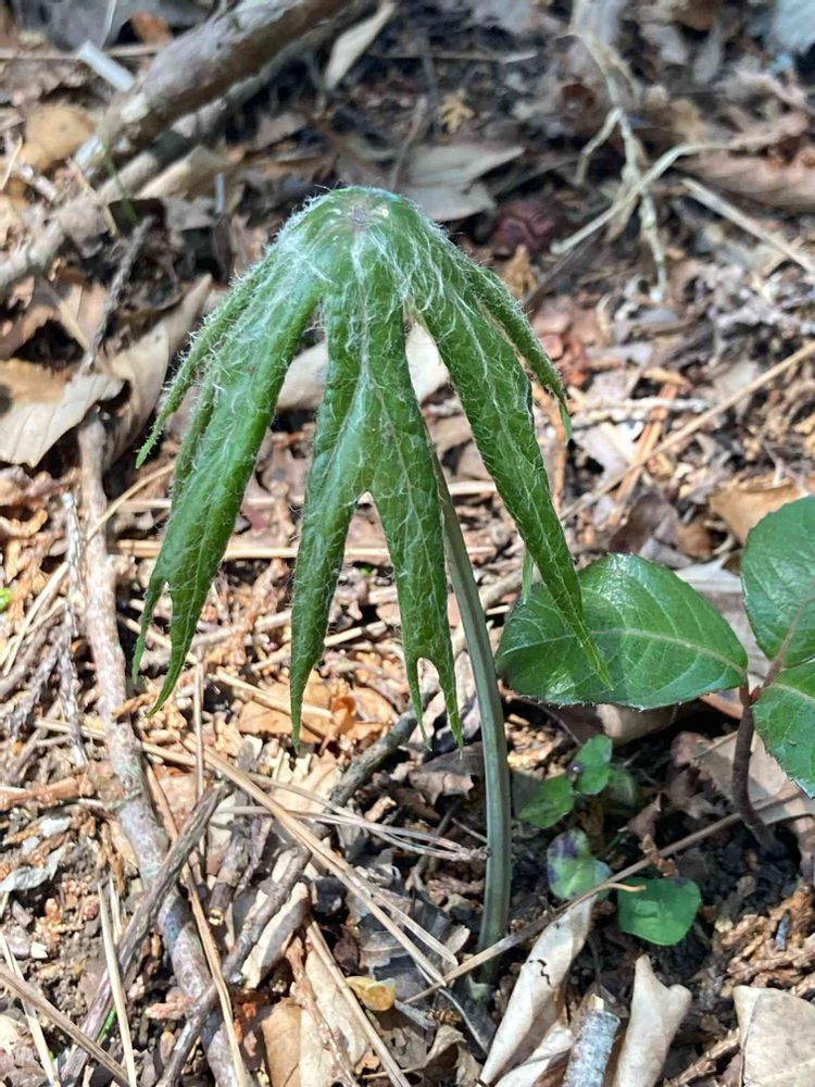 ヤブレガサです。夏に葉っぱが展開して地味なお花が咲く頃はあまり興味が無くなるんだけど、この赤ちゃんの時は可愛い❣️破れ傘の名前の由来通りですよね。この時期は食べられるって書いてました。4/10静岡市にて