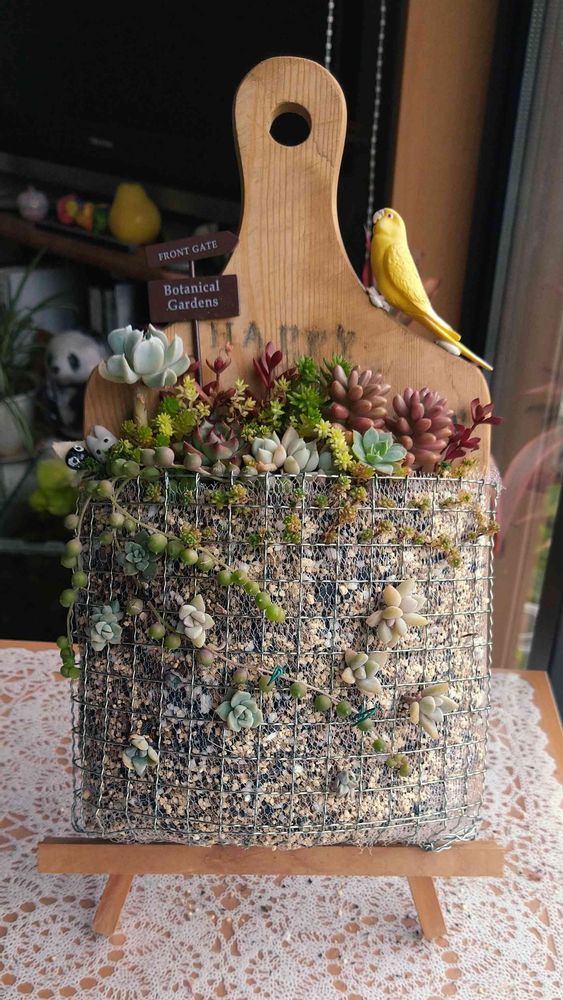 はい、ダイソーのバーベキュー用の網を切って板にふくらませた状態にホチキスで留め土入れました。