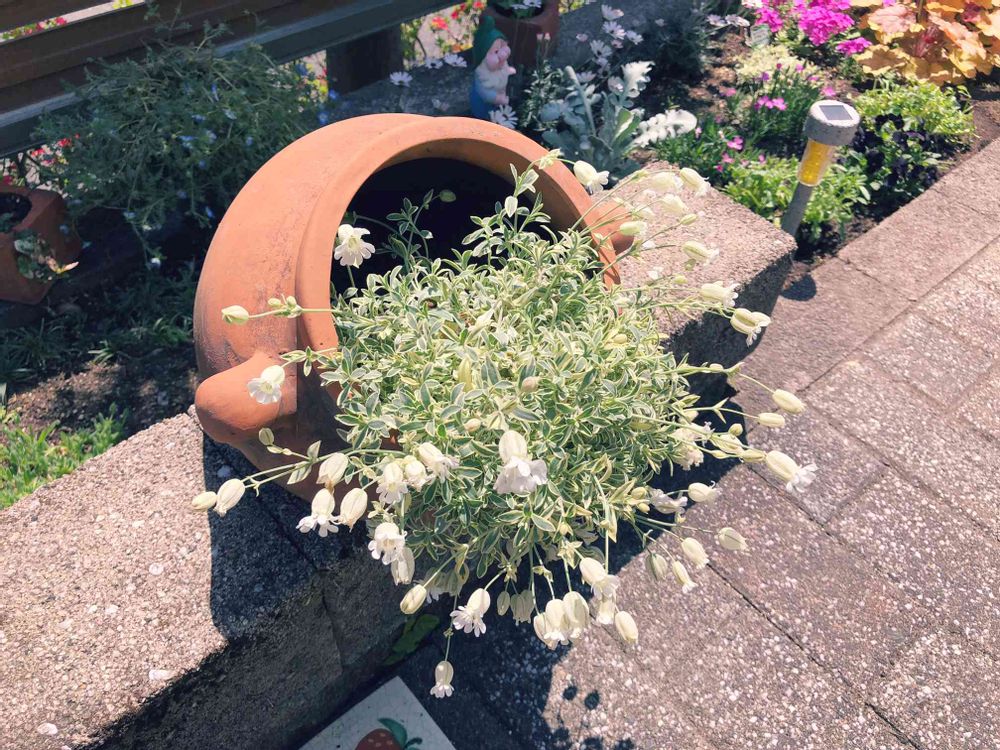 シレネユニフローラが鉢からこぼれる様に咲いています。