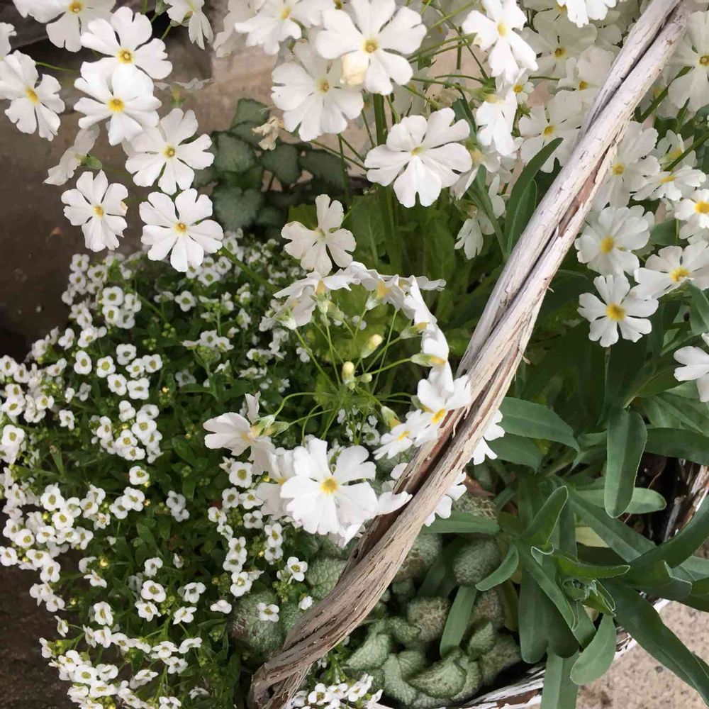 さんありがとうございます😊古いカゴをペイントして、白い花ばかり植えました。ちょっと桜草が育ち過ぎましたが😅横の白い葉っぱはこれから咲くオンファロデスです🌱