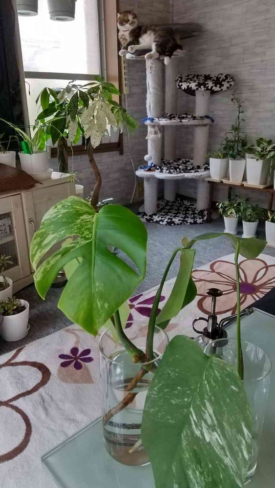 お気になさらないでくださいね☺️アドバイスを頂けるの嬉しいです👌(*ó▿ò*)前回の斑入りモンちゃんは茎と根だけのカットをお迎えしたので、時期も寒さピークの上に、雑菌されてない物だったのです🥺