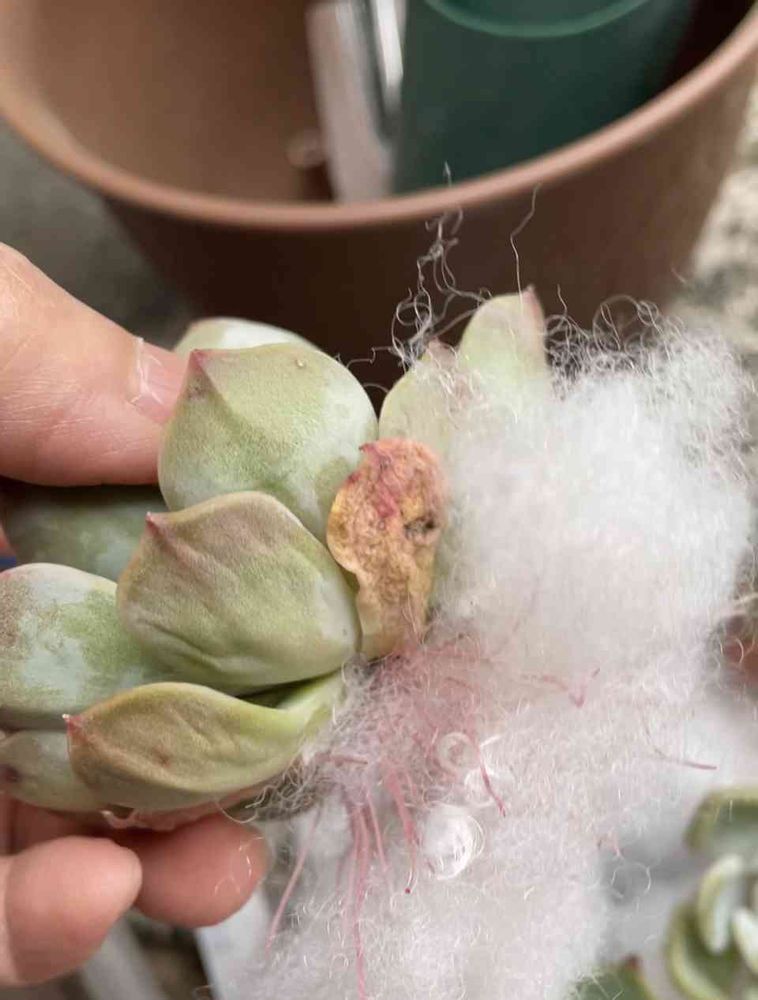 この子はメルカリで購入後、1ヶ月以上梱包材のポリエステル綿に置いたまま放置していた多肉のモーサンです。