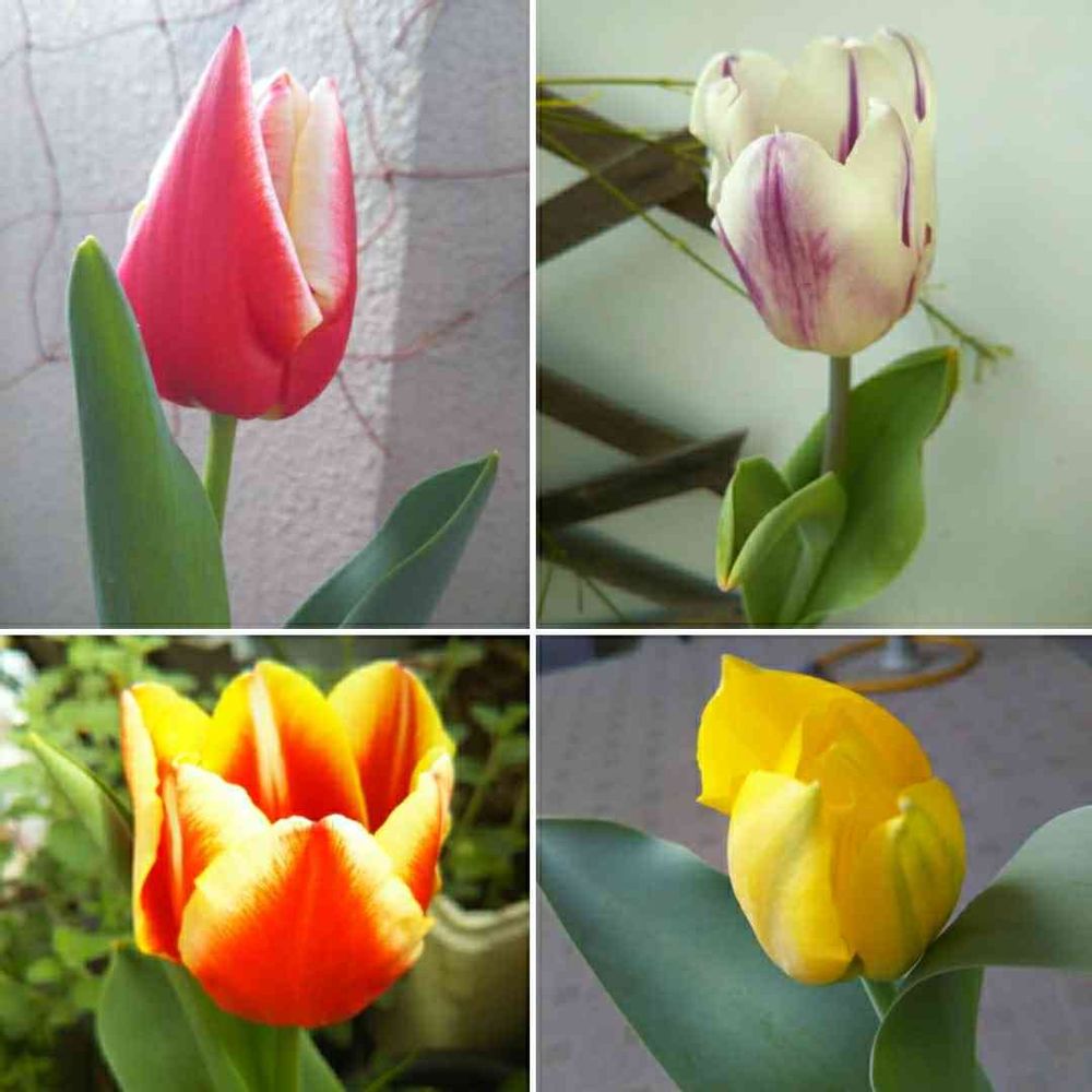 チューリップ 今年は四球で5色でした。↖️左側上下は同じもので、黄色から白へ色変わりしました。