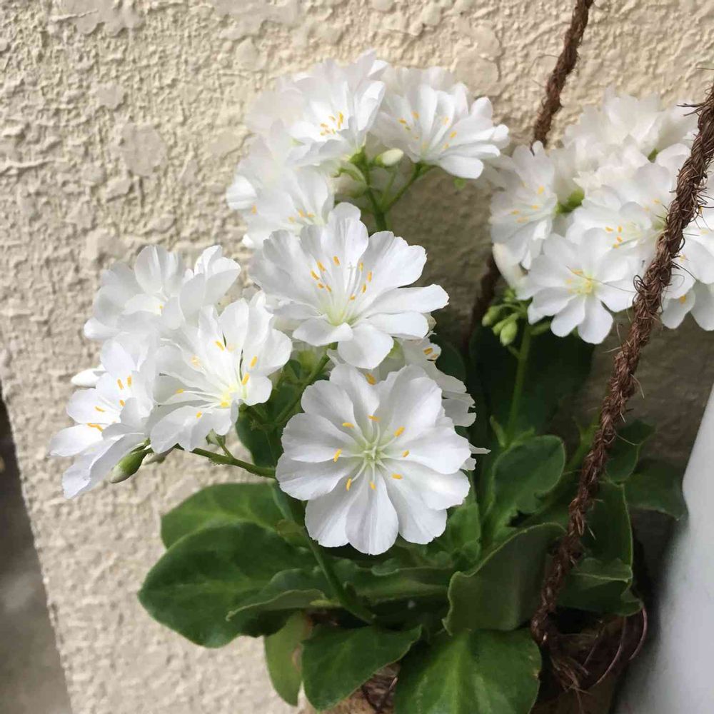 白いレウィシア、今年は吊り鉢にしてみました。今年こそ枯らさないぞ✊