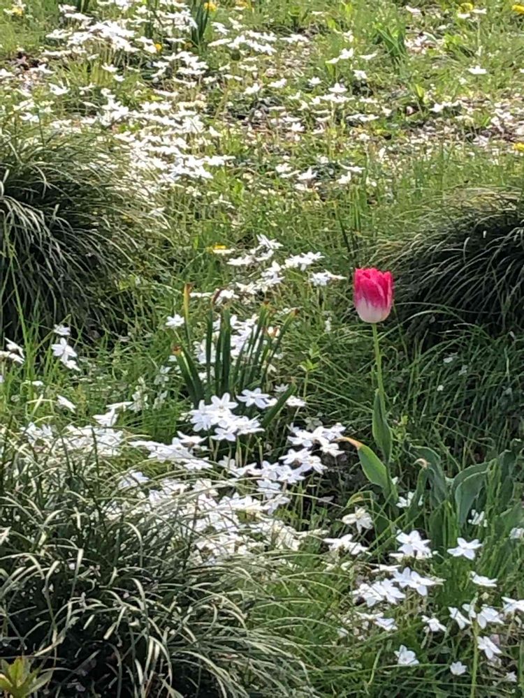 さん、真っ白なハナニラの中にポツンとチューリップ🌷