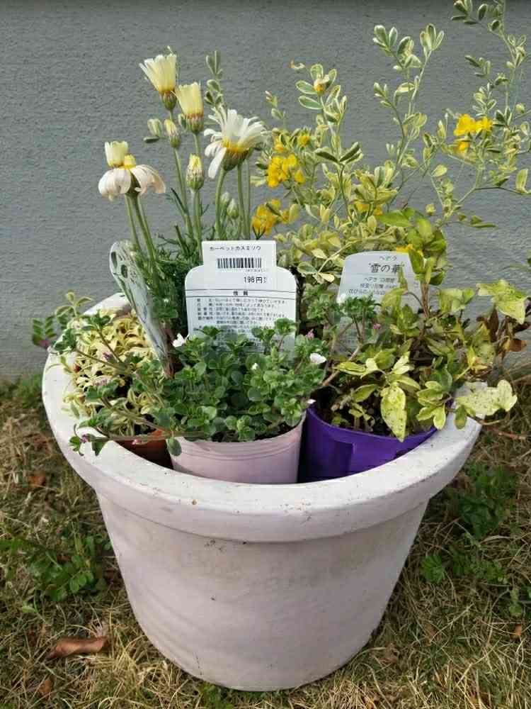 地植えにすると夏は枯れてしまいそうなので、とりあえず秋に買ってきて放置していたヘデラも入れて寄せ植えにしてみようとこんな配置かなぁ~?