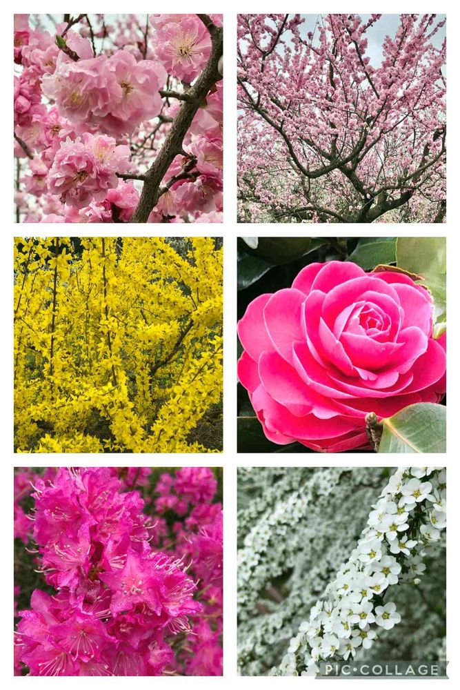 上段は、紅梅。中段は、レンギョウと乙女椿。下段はミツバツツジ、雪柳です。