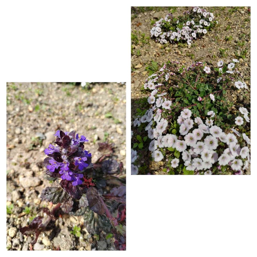 左⬅アジュガの花が咲きました。冬の間生きてるか??どうか反応無かったのを株分けして植えました。3株のうち2株根付いてくれました🙆😃👍