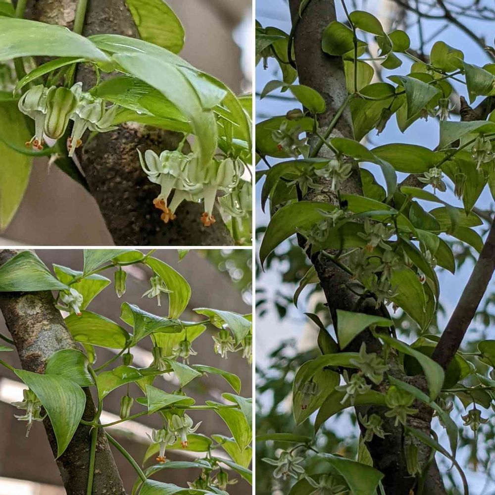 アオダモの幹を登っているスマイラックス~4月初め小さな蕾を見つけて…やっと咲き始めました🤍🌿