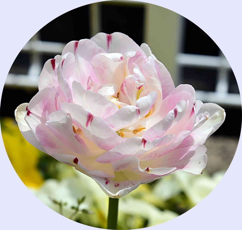 シャクヤク咲きチューリップ🌷、先日アップした球根と同品種のようなのですが、こちらは、花びらが薄いピンクに変化してきています。