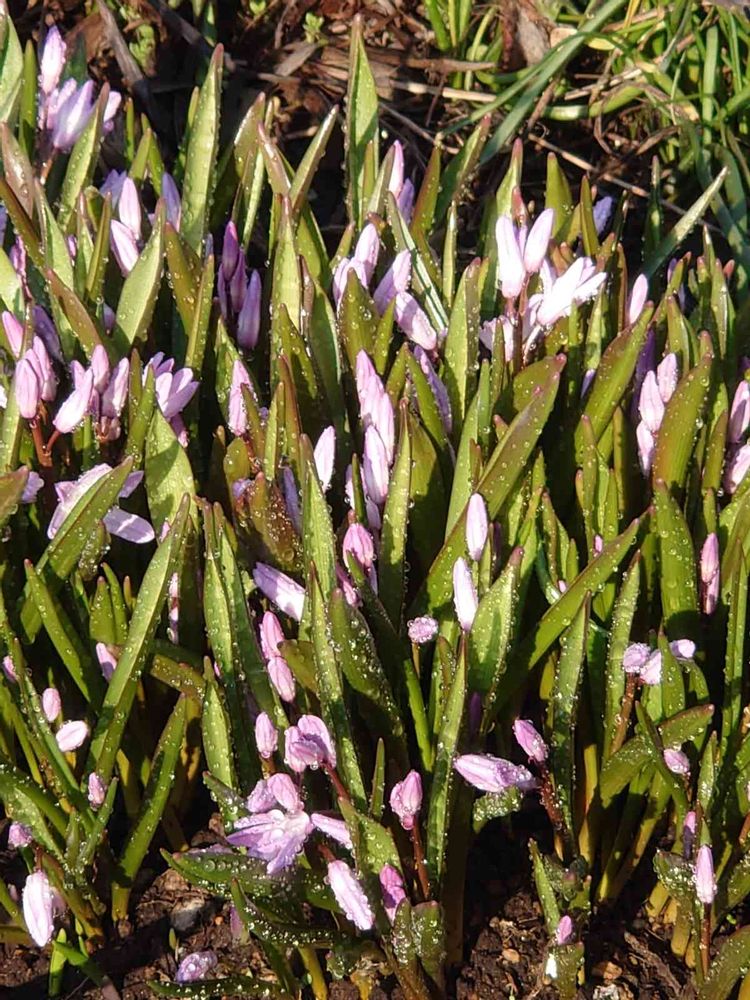 昨日から降っていた雨が朝にはやんでいました。もうすぐ咲きそうなチオノドクサ(ピンクジャイアント)が雨粒を纏ってキラキラ✨