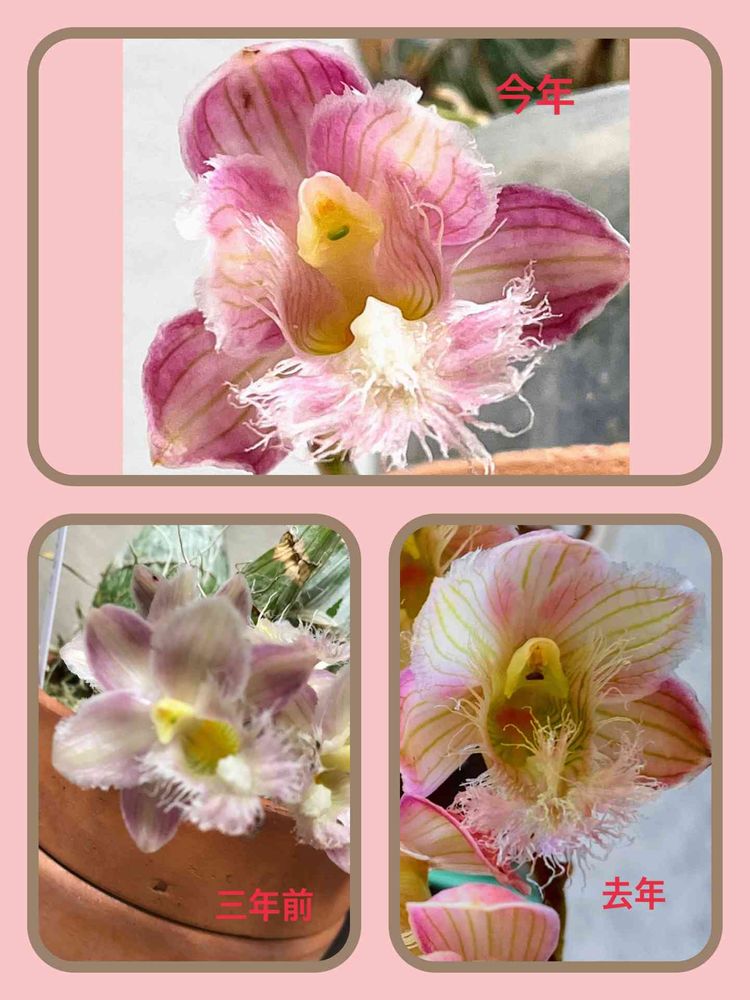 とても珍しいカラーリングが出て三年前はやや渋めのパープルピンク🌸去年がマダラピンクで今回は株分け株の方に非常に濃いピンキーカラーが出ました🧐