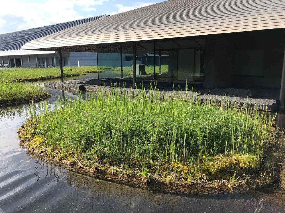 桜咲き鶯が鳴き草木の芽吹く山々、琵琶湖畔にある美術館は水盤のような庭に浮き島が。