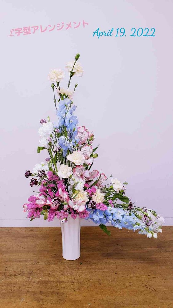 L字型アレンジメントだったんですが、頭で立体図をイメージして活けてくの、とっても難しくて、