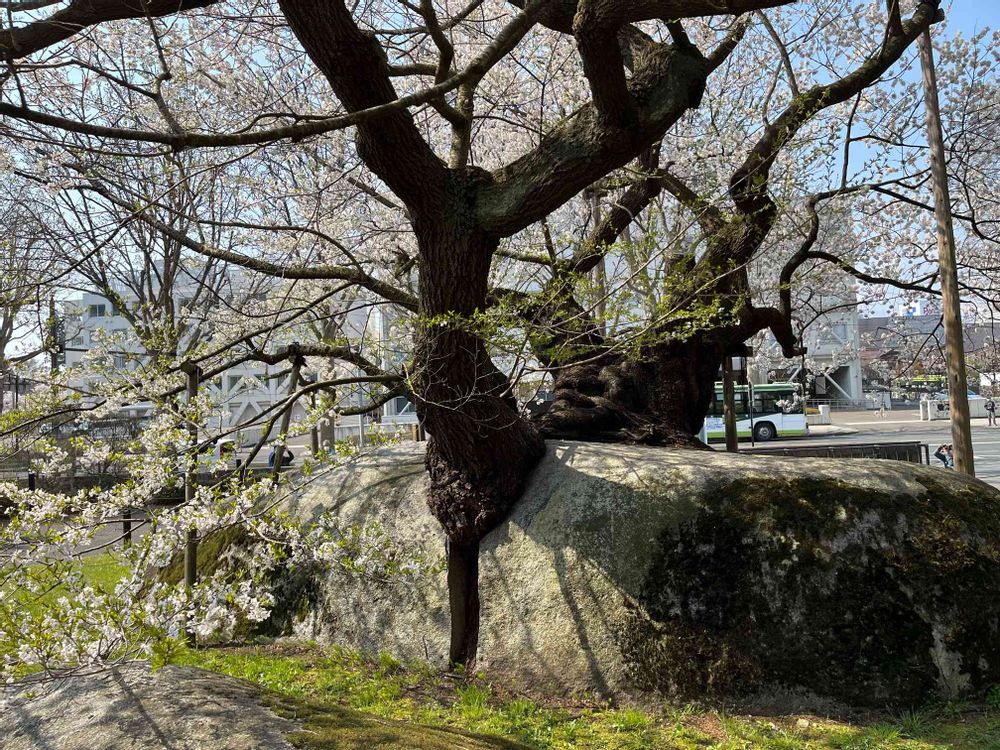 庭石の割れ目に桜の種が飛んできて目を出し成長するにつれ、石を割りながら成長し今の姿になったとのこと!