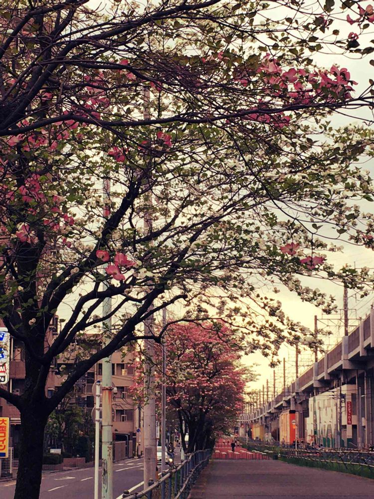 ピンクと白のハナミズキの街路樹が、高架線に沿って満開に花を咲かせていました。