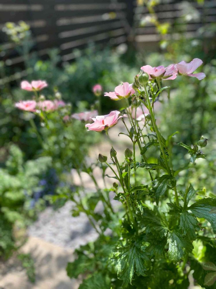 小道の1番奥で2番目に開花したのはラナンキュラスラックスアウラ𓆸⋆*透け感のあるピンク色がカワイイよ*ˊᵕˋ*