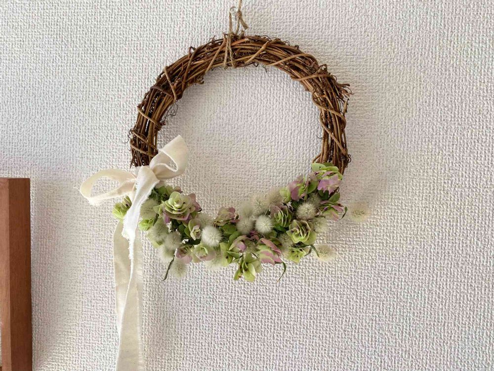 花オレガノケントビューティーと種まきしたラグラスバニーテールの簡単リースを作りました。