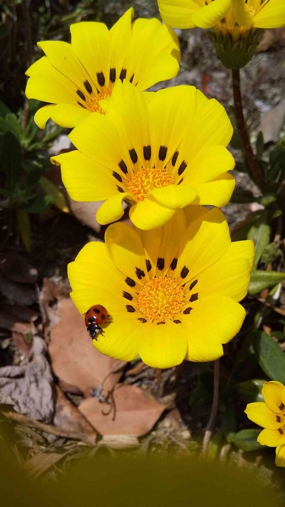 お昼休みに黄色い「ガザニア」のお花をパチリ!真っ赤な「てんとう虫」さんがいました。📸💛🐞🤗😊😄🌞👌