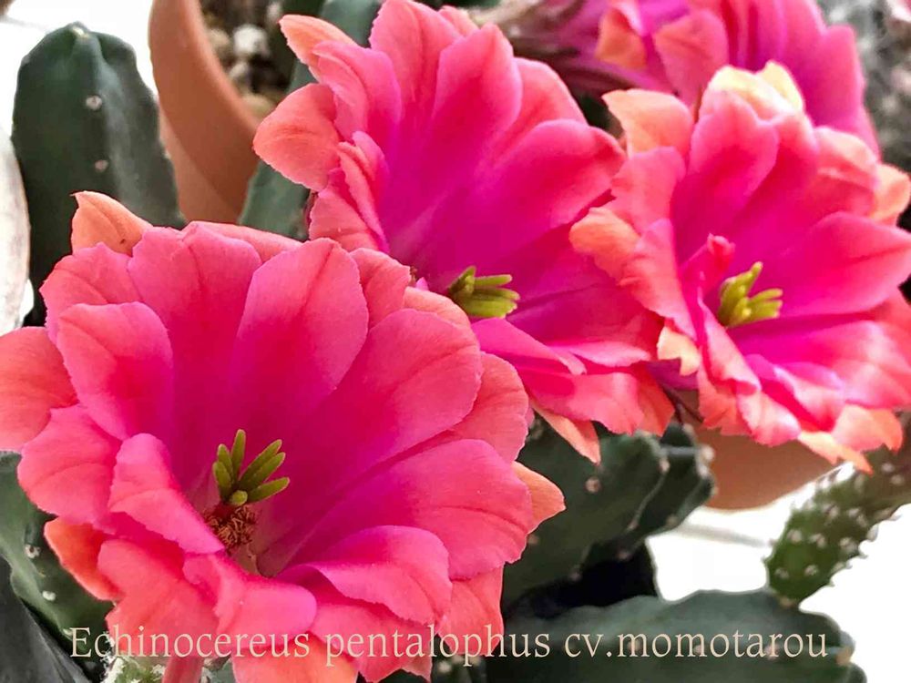 桃太郎くんはフニャフニャ🌵してて、不思議くんですネ✨あまり見かけないコだね🙄、こんなキレイな花が咲くんだね✨💕😆ピンクの花🌸のコもいるけど、こっちの色の方が好きかな😄