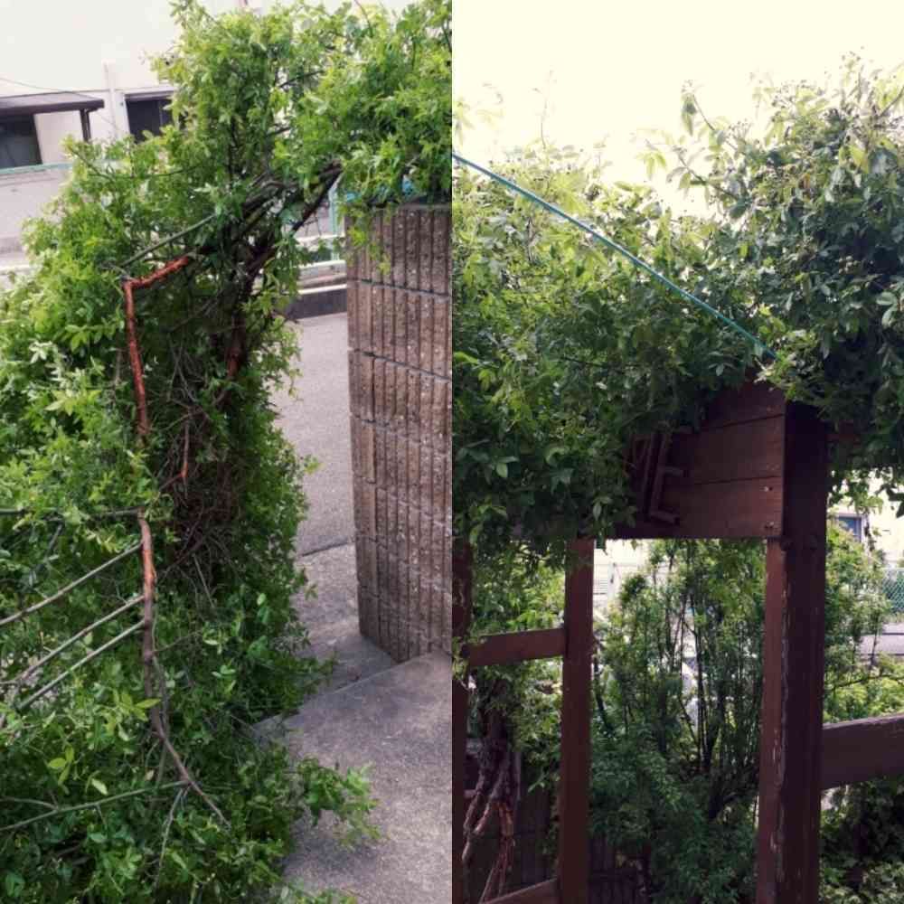 旦那さんが、なんとかアーチに乗っけて補強してくれたけど、所々枝が折れちゃってて😢