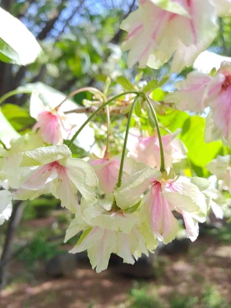 鬱金桜は、淡い黄緑色からピンク色に変わっていく花ですね😃