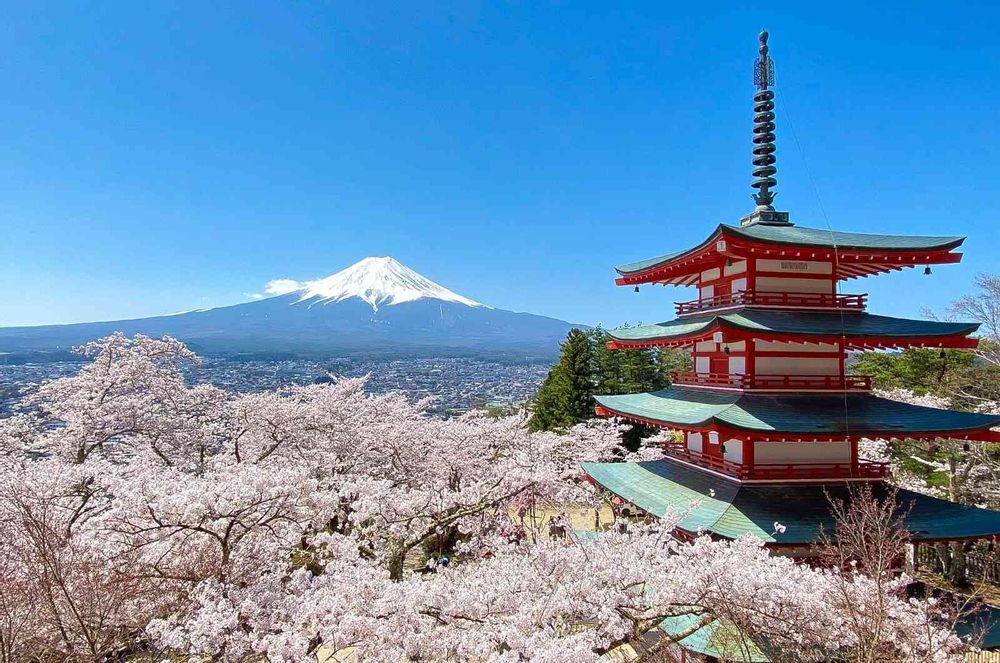 富士山も桜も青空も五重塔の赤い色も全てが完璧✨