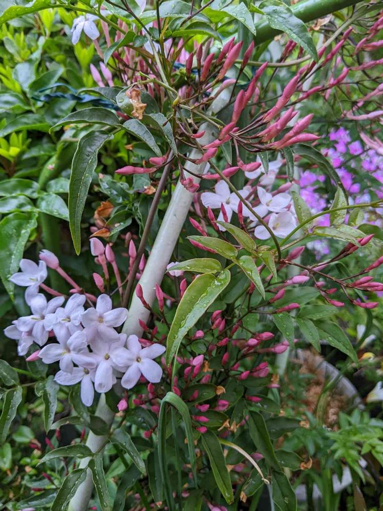 昨年の、5月に近所から引っ越しをしてきた、羽衣ジャスミンです。来たときは、小さくて痩せていましたが、1年私の所で過ごし、株が太り豪勢になりました。