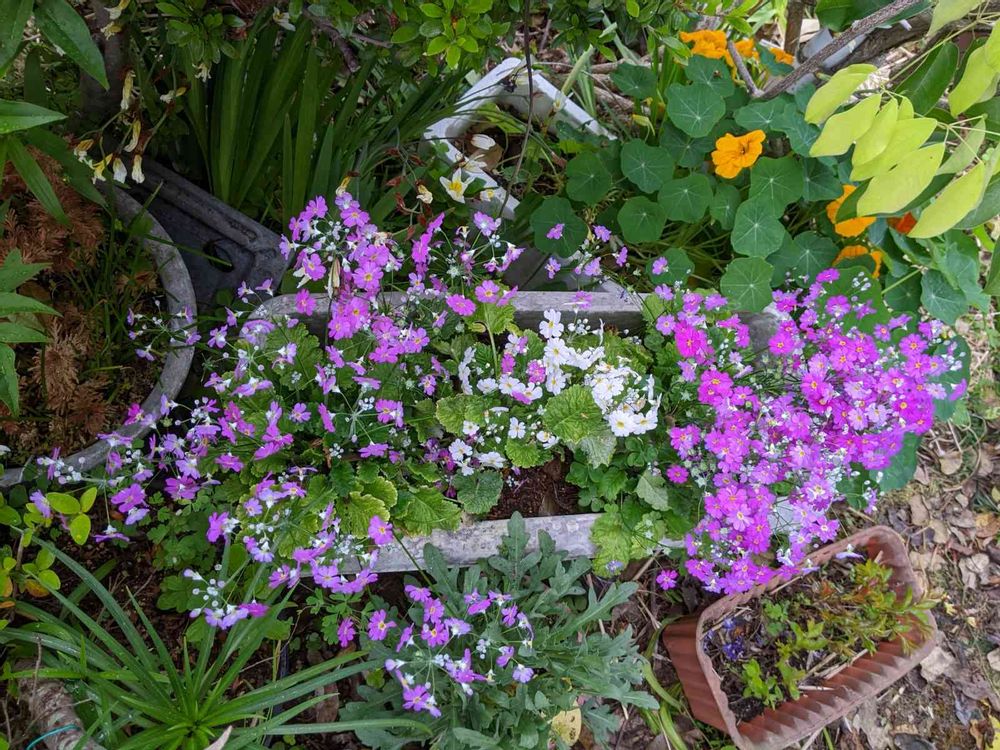 ピンク色のサクラソウの中に。玄関から引っ越しをしてきた、プリムラ・マラコイデスの白色、近くに、キンレンカも、見守ってくれてます。