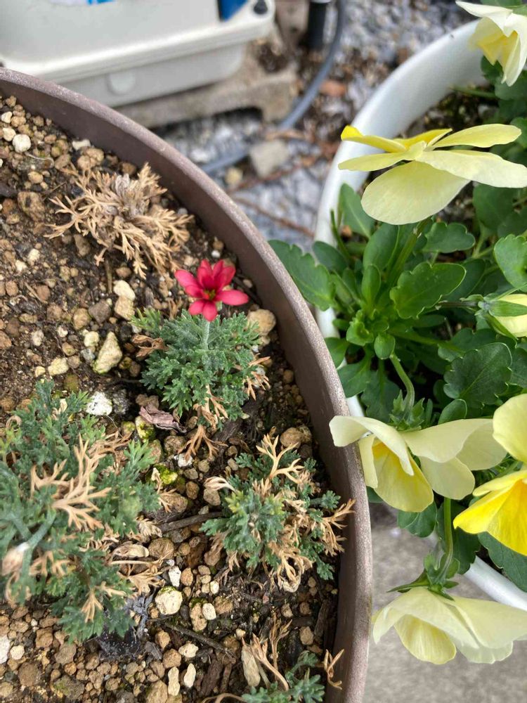 3年くらい前に地植えにしていたローダンセマムが木質化して、ボロボロになり、鉢上げしてカット。元株以外にも挿し芽をしたり様子見ていましたら、ミクロなお花が咲きましたヾ(*´エ`*)ノ