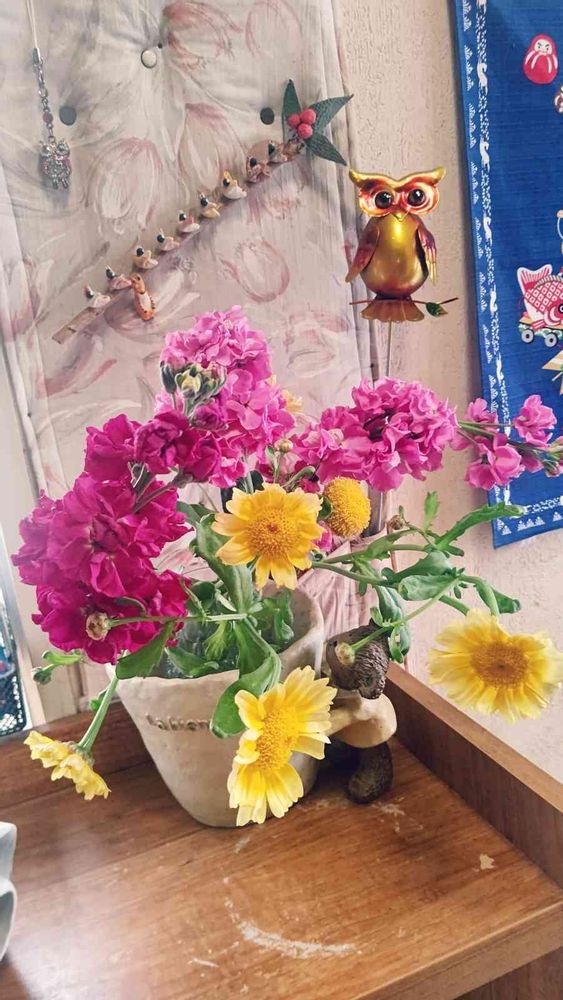 今朝、ご近所の花友達が切り花🌺を持って来てくれました💐早速玄関に飾りました🐸💞