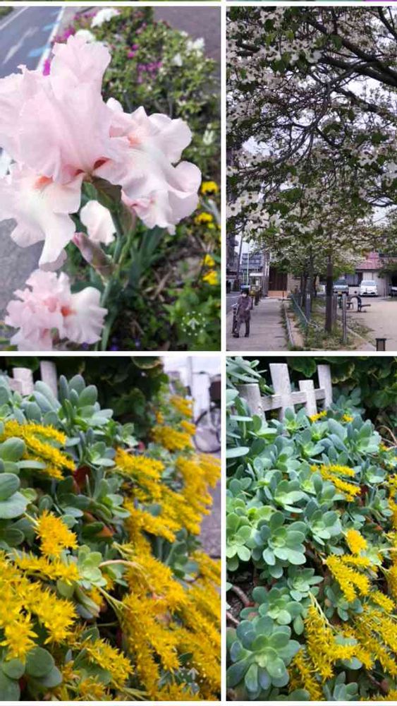 犬🐕の散歩で黄色の花🌼が咲いてる 薄化粧の見事な事❗️こんなに咲いてるの 初めて見ました。そして、ジャーマンアイリスのピンク優しい色です^ - ^ ハナミズキの白も咲いてて春は、良いね😊