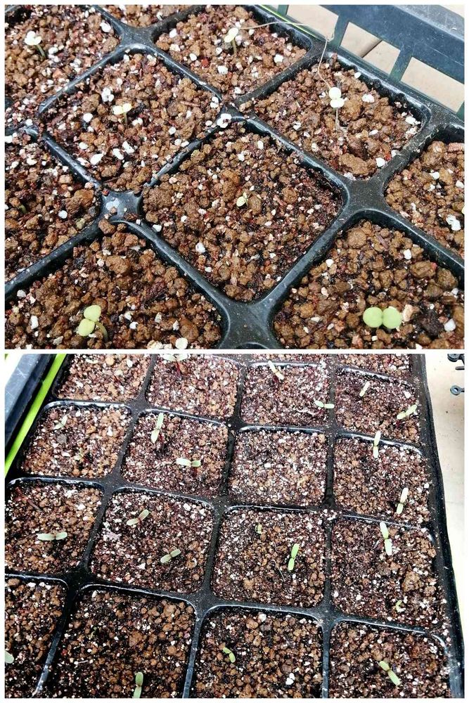 まだ発芽中で土がモコッとしているところもありますが、どちらも発芽率100%近いんじゃないかしら? 優秀だわ〜😊 発芽が揃いきったら発芽率を数えてみたいと思います。